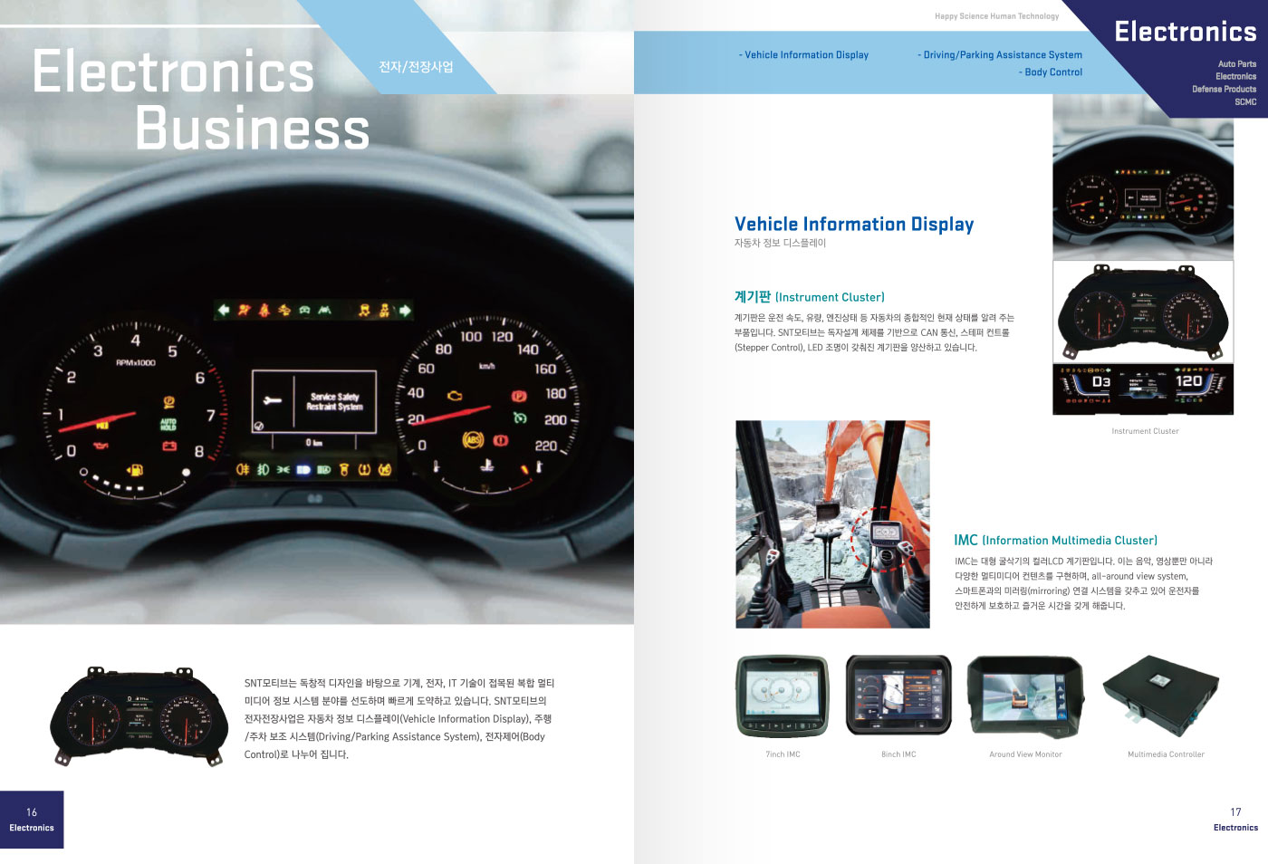 SNT모티브의 전자/전장사업은 자동차 정보 디스플레이, 자동차 엔터테인먼트 시스템, 주행/주차 보조 시스템, 전자제어 파트로 나누어 집니다.